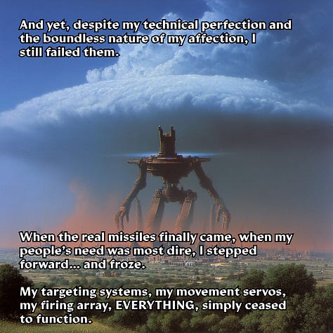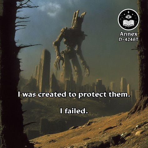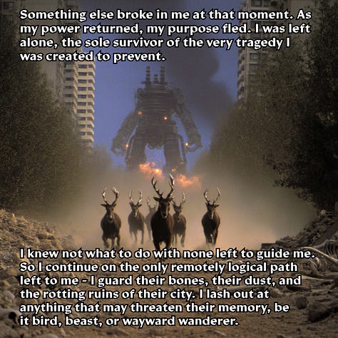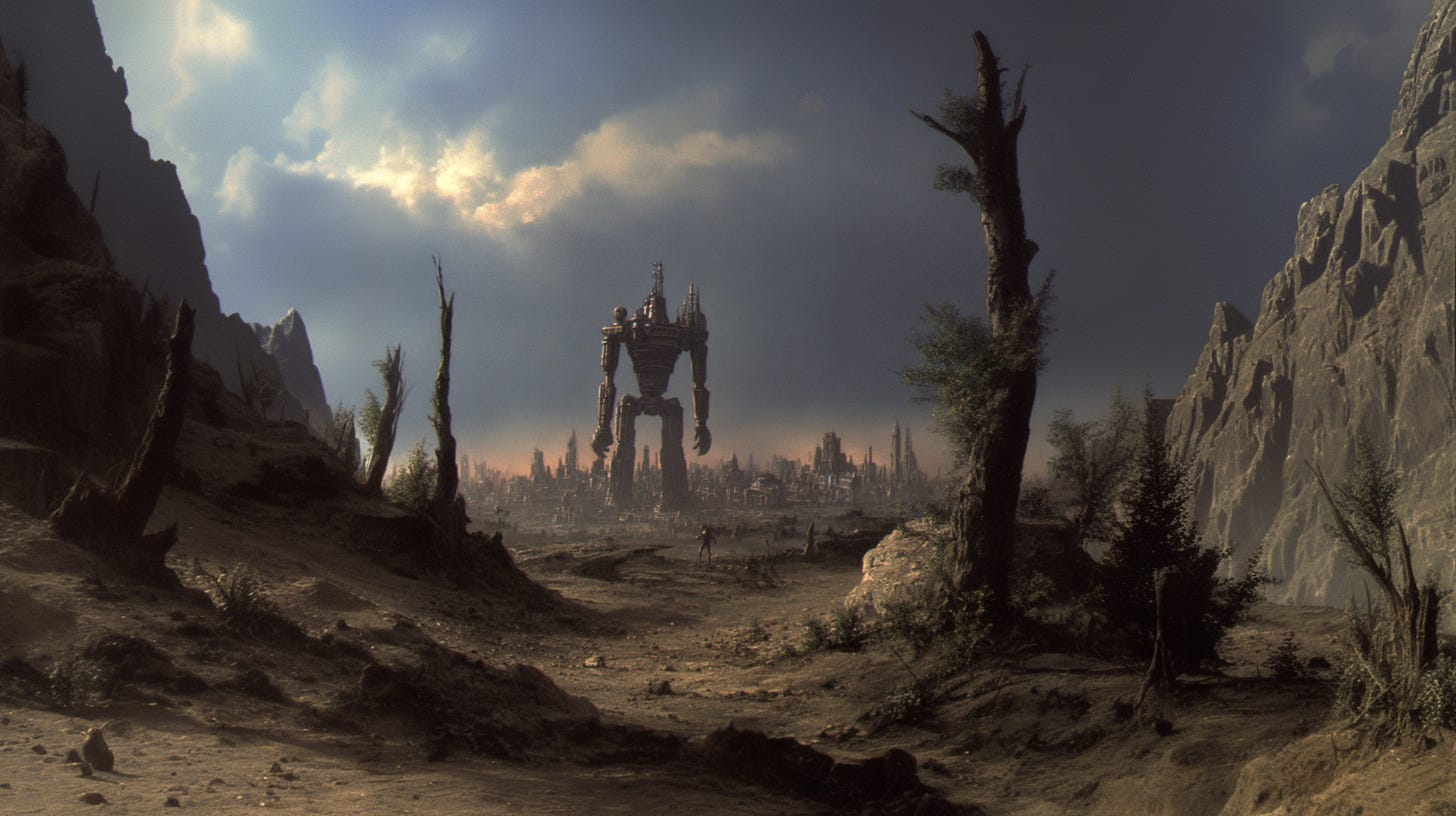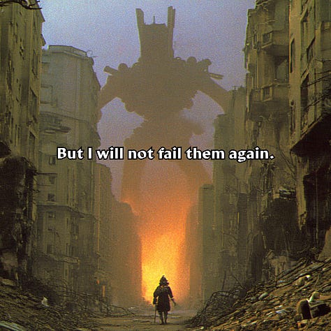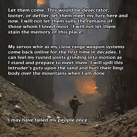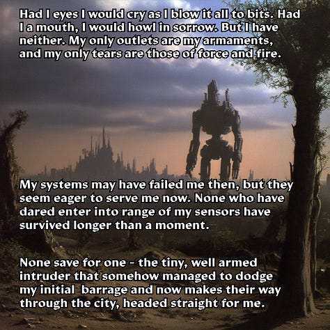 I learned rather quickly why so many junior hunters lost their lives trying to take the damn thing down, and why Hunt Master Poligek had been forced to up the contract’s estimated lethality rating (much to his chagrin). The titan was much faster than I gave it credit for, far nimbler than one would expect something of its size to be. I thought I’d be attacking a fairly stationary target, but that wasn’t even remotely the case. Its joints may have coughed clouds of rust every time they moved, but that made it no less rapid in its assault, and no less ferocious in its attacks. In addition, its weapons were far from limited to the long-range seeker rounds that I had to dodge on my approach. The burst cannons on its torso would have turned me into a fine red mist had my reflector shield not been fully charged, and the whirling plasma whips that sprouted from damn near every surface as I tried to climb its legs sent me hurtling through the air when they met my ferro-plated armor. “Godsdamn you Poligek.” is all I remember thinking in the blissfully painless moments I spent aloft before my unceremonious meeting with the ground on the other side of the city.